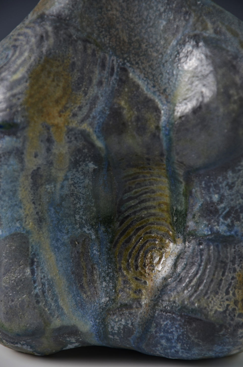 coil-built sculptural vase with spiral sgraffito under a wood-fired oribe glaze